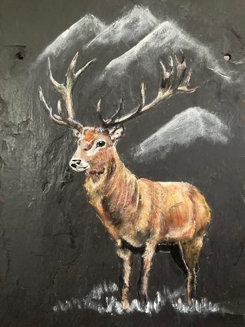 Gillian Edward, Stag Doo Acrylic on Reclaimed Slate 25 x 41 cms SOLD |